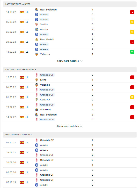 Xét về mặt thành tích đối đầu, Granada đang tỏ ra vượt trội hơn hoàn toàn so với đối thủ bên kia chiến tuyến là Alaves. Sau 5 lần chạm trán gần nhất giữa hai đội, Granada có tới 4 chiến thắng trong khi Alaves chỉ giành được duy nhất 1 trận thắng trước đối thủ.